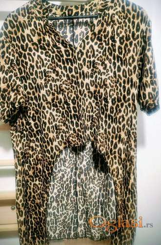 Tekst oglasa: <p>Tunika od viskoze i pamuka , sa V izrezom, animal printa, kraćih rukava, M veličine, dobro očuvana, veoma praktična, lagana, bez obzira na kraće rukave nosiva kroz sva godišnja doba. Prednji deo do kukova, zadnji deo midi dužine. Veoma llepo stoji na famericama i helankama.</p> |