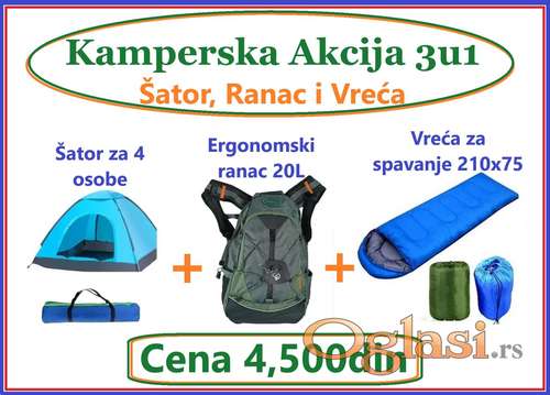 Tekst oglasa: <p>Plavi Šator za četri osobe 200x200x135cm</p> <p>Odlični za kampovanje kao i za malu decu jer ih mrežica štiti od insekata.</p> <p>Otporni na kisu i vetar .</p> <p>Šator je lak za postavljanje i praktican za nosenje.</p> <p> </p> <p>Ergonomski Juboury ranac torba zeleni i crveni 20L</p> <p>20L hidratacijski ranac--Jubouri vazdušno hlađenje 3D podrška za leđa Dizajn hidratantna torba za ruksak sa navlakom za sve vremenske uslove. Nepromociv i vez od napred radi smanjenja opterecenja na kucmu.</p> <p> </p> <p>Vrece za spavanje 210x75</p> <p>Vreće za spavanje su odlicne za neko iznenadno putovanje.Novo, u originalnom pakovanju</p> <p>Odlicne vrece i kvalitetne vrece.</p> <p>Odlicne za kampovanje.</p> <p>Vodootporne.</p> <p>Dimenzije: 210x75</p> <p> </p> <p>POŠALjITE VASE IME PREZIME</p> <p>ADRESU I BROJ ZA KURIRA</p> <p>Poručite 3 i više artikala</p> <p>dobijate 10% popust!</p> <p>Moguce lično preuzimanje Bg</p> <p>SMS / Viber/ WhatsApp</p> <p>+38162/812-40-44</p> <p>LUX SHOP</p> <p>Svi naši artikli su</p> <p>fabricki zapakovani!</p> <p>Garancija godinu dana</p> <p>Isporuka Postexpress</p> <p>kurirskom sluzbom</p> |