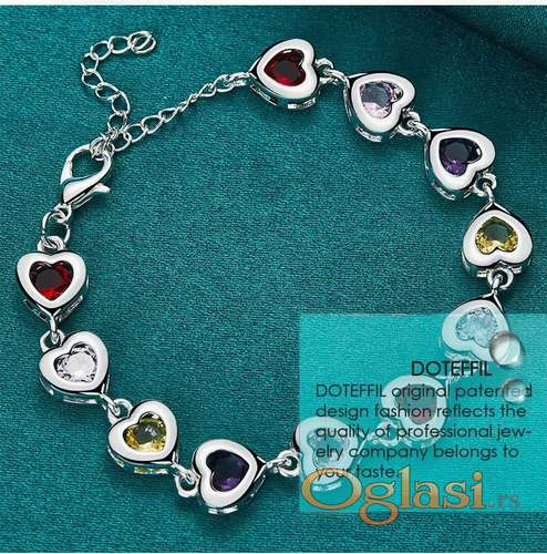 Tekst oglasa: <p>Srebrna narukvica izrazito lepa i jedinstvena, ukrašena sa cirkonima u savakom od srca.</p> |
