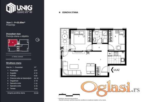 Tekst oglasa: Lux novogradnja u Krnjači. Odlična lokacija, blizina BG voza i GSP-a. Mogućnost kupovine na kredit. Planirano useljenje početkom marta 2027. godine. PROSTORIJE: kupatilo, kuhinja, dnevna soba, 2 spavaće sobe, terasa. agencijska provizija 2% |