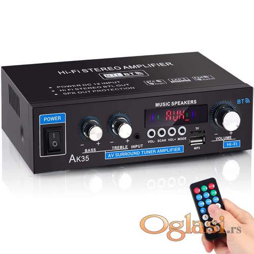 Tekst oglasa: <p>AK35 radio pojačalo 60 w prave snage 30w x 2 ,radi na 220 v i na 12 v pa je idealno da se ukljuci bilo gde u kuci , kaficu ili automobilu .</p> <p>Ima FM radio , buletooth 5.0, USB, čitac memorijske kartice , AUX 3.5 , cink priključke, veliki potenciometar za ton , 2 ekvilajzera, daljinski,vumetar i SPK zastitu izlaza zvucnika da neizgorite izlaze.<br /> Dugme za pojacavanje tona i ekvilajzere su metalna.</p> <p>NAPOMENA><br /> Uredjaj je 60 w prave snage a ne kao sto neki navode kod svojih pojacala kao sto su Tely ili neka druga 400 ili 800 W sinusne snage a u stvari su 20 W prave snage. </p> <p>Sada na popusti 4300 dinara.</p> |