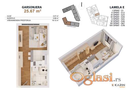 Tekst oglasa: <p><strong>SPECIJALNA PONUDA SAMO KOD NAS !!!</strong></p> <p><strong>JOŠ 4 GARSONJERE U PONUDI !</strong></p> <p><strong>CENA: 3.100e/m2 sa PDV-om</strong></p> <p><strong>PLAĆANJE U 6 RATA BEZ KAMATE !</strong></p> <p><strong>15% - 20% - 20% - 20% - 15% - 10%</strong></p> <p>Predstavljamo Vam kompleks Central Park Residence u Novom Sadu koji se nalazi na Bulevaru partijarha Pavla na granici južnog i severnog Telepa i Novog Naselja.</p> <p>Central Park Residence je savršen izbor za sve koji žele sigurnost, kvalitet, tačnost , lokaciju.</p> <p>Kompleks se sastoji od 5 Lamela spratnosti 2Po+Pr+8 i 2Po+Pr+12.</p> <p>U samom srcu kompleksa se prostire dvorište na oko 2.200m2 koje će biti uredjeno sa šetalištem i klupama za opuštanje, igralištem za decu kako bi svaki vaš dan bio ispunjen. Uz sam kompleks će se na parceli nešto više od 10.000m2 graditi gradski park .</p> <p>Sam kompleks sadržaće market, apoteku, restoran i sve što jedan kompleks treba da sadrži, a u neposrednoj blizini se nalazi Osnovna škola “Miloš Crnjanski“, Satelitska pijaca, Vrtić „Vendi“, Vrtić „Guliver“, parkovi, marketi i restorani, kao i autobuska stajališta koja idu u svim pravcima prema fakultetima i centru grada.</p> <p><strong>Prodaje se garsonjera stan broj 78 na osmom spratu dvorišno orjentisana projektovane površine 25,67m2 . Stan klasičnog rasporeda . Sastoji se od klimatizovanog dnevnog boravka sa kuhinjom , kupatilom.</strong></p> <p>Od materijala koji se koriste prilikom izgradnje zidamo sa spoljnim <strong>klima-blokom 20cm</strong>+10 cm kamena vuna kao izolacija, unutražnji pregradni zid zidamo sa <strong>pregradnim-blokom debljine 25cm</strong> izmedju stanova, a pregradni zidovi u samom stanu se zidaju <strong>pregradnim blokom 10 cm</strong>.</p> <p>Grejanja sa kalorimetrima, plaća se po utrošku u grejnoj sezoni što je izuzetna ušteda, parket hrast, pločice granitne prve klase, sigurnosna ulazna vrata, sedmokomorni PVC sa troslojnim staklima i elektronskim podizačima roletni, mermerne klupice ispod prozora.</p> <p>Na našem sajtu <strong>karininvest.rs</strong> možete videti kompletnu ponudu , kao i interaktivnu mapu kompleksa Central Park Residence.</p> <p>Više informacija možete dobiti svaki radni dan od od 08:00 – 16:00 časova na brojeve telefona <strong>065/823-8127</strong><strong> ; 065/823-8317</strong> kao i <strong>021/529-528.</strong></p> |