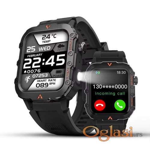 Tekst oglasa: <p>LAXASFIT Q11 pametan sat G Shock sa velikom ekranom od 1.71 inca, bluetootom 5.2, pravom baterijskom LED lampom, senzorima za temperaturu, krvni pritisak, broj otkucaja srca, nivo kiseonika u krvi, player za muziku, daljinski za vas mobilni telefon za muziku, video, kameru, možete primiti poruke i pozive sa telefona na pametan sat.</p> <p>Sat je vodootporan do 50m i dolazi u lepoj kutiji pa je idealan za poklon.<br /> Može se povezati na Android 5 i novije i IOS 9.0 i novije telefone.</p> <p>Detalji:<br /> - ekran 1.71 inch touchscreen <br /> - bluetooth 5.2 domet do 10 m i<br /> - baterija 200MAh.</p> |