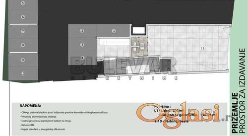 Tekst oglasa: Izdaje se objekat u izgradnji na jednoj od najtraženijih lokacija u gradu u neposrednoj blizini Doma zdravlja. Od pomenutog objekta izdaje se prizemlje površina 100m2, galerija 100m2 i podrumski deo 350m2.. Objekat je pogodan je za privatnu kliniku sa aprtmanskih smeštajem, raznovrsna predstavništva, programerske kuće, privatne škole, banke , ugostiteljski objekat, teretane,.... Neke od osnovnih karakteristika ovog savremenenog objetka je smart house sistem gradnje, kombinacija alubond i demit fasade, klima blok sa zvučnom izolacijom, spoljna aluminijumska stolarija sa termoprekidom, troslojna stakla, roletne sa elektro motorima, podne obloge od granitne keramike i troslojnog parketa ekstra klase. Sistem grejanja i hlađenja su toplotne pumpe, split sistem. Prednost zakupa u ovom stepenu izgradnje je moguć odabir i izmene određenih materijala počevši od spoljne i unutrašnje stolarije, podne obloge, vidova grejanja i hlađenja, sanitarije i ostalo, kao pregrađivanje prostora prema nameni zakupca. Zbog svih izmena koja su moguća u fazi izgradnje objekat se izdaje isključivo na duži vremenski period. Obavezan depozit u visini jedne mesečne kirije. Agencijska usluga je 50% od prve mesečne zakupnine. Za više informacija javite se na telefon agencije. Ovo je samo deo naše ponude.Naša preporuka Vaš izbor! Ovu kao i druge nekretnine možete pogledati na našem sajtu. Čekamo Vas! ******* |