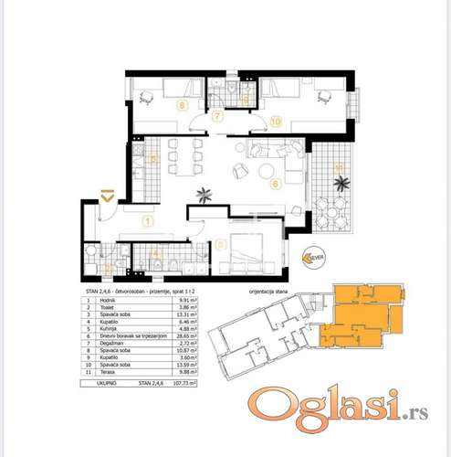 Tekst oglasa: NOVOGRADNJA - 4.0 LUX STAN NA NAJCENJENIJOJ LOKACIJI U BEOGRADU, STARI KOŠUTNJAK, PRODAJA BEZ PROVIZIJE! Kontakt: +381668091211 Cena: 317.800 € + PDV Lokacija: Rakovica, Stari Košutnjak, prizemlje Površina: 107.73 m2 Struktura: Četvorosoban stan koji se sastoji od: - Prostrane open space dnevne sobe sa terpezarijom; - Tri spavaće sobe; - Kuhinje; - Dva kupatila; - Toaleta; - Hodnik; - Deganžmana; - Velike terase. OPIS: Na prodaju luksuzan četvorosoban stan, površine 107.73 m2, smešten u prizemlju, moderne stambene zgrade, izuzetnog kvaliteta i estetike, u naselju Stari Košutnjak. Završetak radova planiran je do kraja 2026. godine. Stan je izuzetno svetao i funkcionalno raspoređen, iz komotnog ulaznog hodnika dolazi se u open space dnevni boravak, čijom celom dužinom se prostire prostrana terasa sa lepim pogledom. Dnevna soba je direktno povezana sa kuhinjom i trpezarijom, koje su praktično pozicionirane i dovoljno prostrane za udobno funkcionisanje višečlane porodice. Stan poseduje i master spavaću sobu sa sopstvenim kupatilom i zasebnom prostorijom za pranje, sušenje i peglanje. Odvojeno od master spavaće sobe, nalazi se drugi spavaći blok sa još dve spavaće sobe, koje dele zajedničko kupatilo. Dodatni toalet, smešten blizu ulaza, pruža dodatni komfor stanu! Stan je poseduje kvalitetnu aluminijumsku fasadnu stolariju sa niskoemisionim staklom, aluminijumske roletne sa elektromotorima, kvalitetna sobna i sigurosna ulazna vrata, granitnu keramiku i sanitariju prve klase. Takodje ima svoju toplotnu pumpu vazduh – voda preko koje će se moći uz pomoć inverter tehnologije, na željenu temperaturu zagrejati ili rashladiti, sa mogućnošću daljinskog upravljanja, uz minimalne troškove. Zgrada u kojoj se stan nalazi sadrži putnički lift najsavremenije generacije, dok je fasada moderna, sa maksimalnom spoljnom termoizolacijom. U okviru objekta se nalaze i garažna i parking mesta. Stan je odlično pozicioniran, nalazi se u mirnom, zelenom okruženju naselja Stari Košutnjak, u blizini Kraljevskog kompleksa Beli Dvor, sa kompletnom dostupnom infrastrukturom: škole, vrtići, prodavnice, pošte, kafići, restorani, kao i odlična saobraćajna povezanost sa ostalim delovima grada, posebno nakon puštanja u rad novog Bulevara Patrijarha Dimitrija. Bez agenciske provizije! |