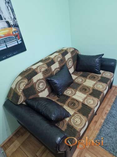 Tekst oglasa: <p>Na prodaju očuvan dvosed knjiga sa fiokama i preklapanju za krevet od eco kože sa tri jastuka</p> |