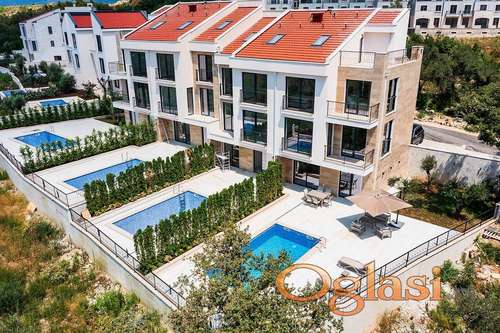 Tekst oglasa: <p>Kuće u nizu na Budvanskoj rivijeri – kompleks ekoloških kuća sa zelenim okruženjem</p> <p>Kuća se sastoji od tri etaže i potkrovlja. Prva etaža nudi prostrani dnevni boravak s kuhinjom, jednu spavaću sobu s vlastitom kupaonicom, gostinjski WC, praonicu rublja, ostavu i ulaz u vrt s privatnim bazenom. Prizemlje se sastoji od prostranog dnevnog boravka, kuhinje s blagovaonicom i gostinjskog WC-a. Prva gornja etaža nudi dvije spavaće sobe, dvije kupaonice, balkon i terasu od 8 m2. U potkrovlju se nalazi spavaća soba, kupaonica, dječja soba i terasa.</p> <p>U prodaji su 4 gradske kuće, a naša preporuka je gradska kuća od 220 m2 po cijeni od 675.000 eura.</p> <p>Budući vlasnici moći će koristiti usluge održavanja doma, softver za upravljanje najmom, profesionalno održavanje lokacije kao i napredne sigurnosne sustave.</p> <p>Svaka gradska kuća opremlena je ugrađenom kuhinjom s kućanskim aparatima. Hrastov parket u spavaćim sobama. Kompletan set sanitarija, uključujući fajanse i Villeroy & Boch.</p> <p>Solarni paneli, pergole iznad parkinga. Video nadzor, interfon, multi-split klima uređaj Cooper Hunter (Kanada)</p> <p>Ugodna lokacija – 10 minuta vožnje do Budve.</p> |