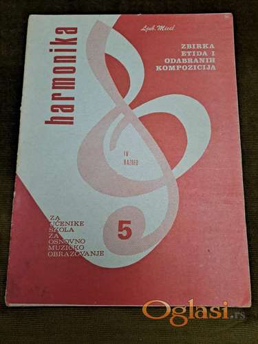 Tekst oglasa: <p>Ljuba Micić, Harmonika. Zbirka etida i kompozicija za četvrti razred osnovne muzičke škole 5( Nota-muzičko izdavačko preduzeće, Knjaževac). Stanje polovno. Cena: 200 dinara. Tel.060-58-58-153 </p> |
