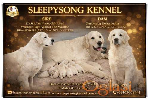 Tekst oglasa: <p><strong>Odgajivačnica ''SLEEPYSONG'' ima u ponudi, NOVO leglo Zlatnih Retrivera. <br /> Rođeni 04.02.2026.</strong></p> <p><strong>DOSTUPNI ZA REZERVACIJU !</strong></p> <p><strong>Za sve informacije pozvati na: +38163668441 Dragan Štetin</strong></p> <p><strong>www.sleepysongkennel@gmail.com</strong></p> |