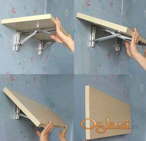 Tekst oglasa: <p>Mehanizam je potpuno nov i nekoriscen. Svaki je atestiran na 60kg po nosacu. Znaci sto sa dva nosaca izdrzava 120kg tezine statickog opterecenja (bez efekta poluge-zbog sirine stola).</p> <p>Preklopni mehanizam je metalni nosac koji sluzi za racionalizaciju prostora u vasem okruženju, i ima siroku primenu u domacinstvu (stanovima, terasama. . . ), industriji, itd.</p> <p>Ova sklopiva konzola je konstruisana tako da u nosecem stanju moze podneti staticko opterecenje oko 120kg po paru.</p> <p>Montaza je jednostavna sa vijcima kroz odgovarajuce otvore (tri za zid i tri za plocu). Kada zelite da postavite sto u gornji polozaj dovoljno je samo da ga podignete dok "klikne" i on se sam zabravi u gornji polozaj. Kada zelite da ga spustite samo pritisnete polugice na nosacima i spustite plocu.</p> <p>Mogu da se koriste za zidne stolove, police ili stolice.</p> <p>Slike nosaca su orginalne a slike primera montaza ovakvih stolova su sa interneta da imate pretstavu o cemu se radi (obicno prvo budu slike sa interneta a na kraju orginalne slike).</p> <p>Dimenzije se vide na slikama.</p> <p>Cena je za 1 komad.</p> <p>NAPOMENA za jedan sto Vam je potrebno dva nosaca. (za vece stolove preko 1.5m je obicno potrebno 3 nosaca)<br /> Znaci 800din x 2 = 1600din za jedan sto.</p> <p>Cene:<br /> Za 2kom (jedan par) 800din/kom<br /> za 4kom i vise 750din/kom<br /> za 10kom i vise 710din/kom.</p> <p>U ponudi imam i malo krace nosace koji su 50din jeftiniji, mozete ih potraziti u mojim oglasima (kraci su i namenjeni su za manje sirine stolova/polica uglavnom kao sank stolovi ili uze police).</p> <p>Dostava 370din nakon uplate na racun ili 570din pouzecem.</p> <p><br /> Za dodatne informacije i porucivanje najbolje pozovite na O649797622 (retko citam i odgovaram na poruke ovde).</p> |