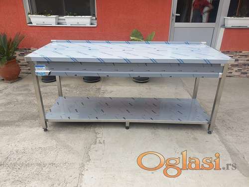 Tekst oglasa: <p>Radni sto je od prohroma sa plocom od kiselo otpornog prohroma,otvoren sa policom na 140mm od zemlje u cenu nije uracunata dostava.</p> |