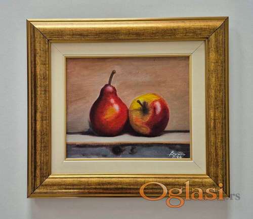 Tekst oglasa: <p>Ulje na platnu Kruska i jabuka, prelepo umetnicko delo. Slika je uramljena u jako lep ram, dimenzije slike sa ramom 49 x 44. Privatna kolekcija.</p> |