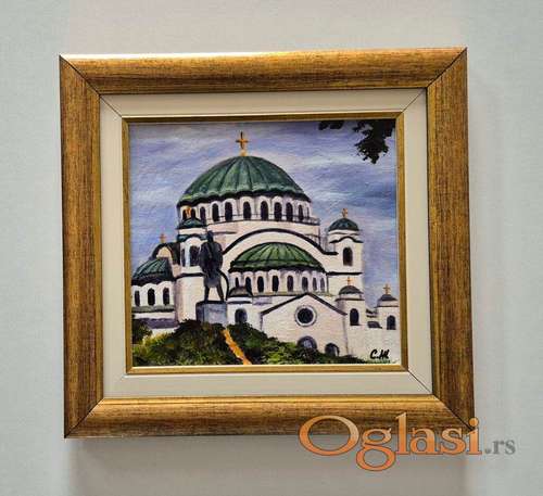 Tekst oglasa: <p>Ulje na platnu Hram Svetog Save, prelepo umetnicko delo. Slika je uramljena u jako lep ram, dimenzije slike sa ramom 34 x 32. Privatna kolekcija.</p> |
