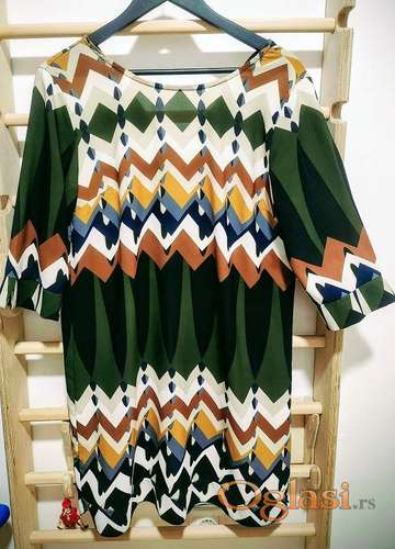 Tekst oglasa: <p>Italijanska tunika haljina, par puta nošena, veoma efektna, lagana, prijatnog materijala i praktična u svim godišnjim dobima i situacijama. Materijal je elastin i poliester. Lako se održava i ne pegla se pa je praktična za put. Veličina je M, iako se vodi pod UNI.Dužina je malo iznad kolena a rukavi su 3/4. Kopčanje na dugme iza vrata.</p> |