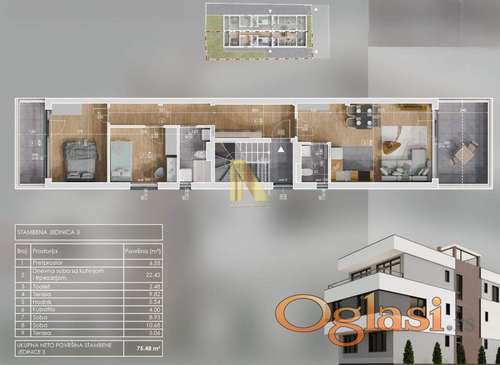 Tekst oglasa: Oglašavamo prodaju dvoiposobnog stana u kvalitetno zidanoj zgradi, u mirnoj ulici koja pruža privatnost i kvalitet na jednom mestu. Stan se nalazi na drugom spratu i pripada mu krovna terasa. Spoljna stolarija je PVC Rehau sa dva stakla u antracit boji. Roletne ALU sa elektro podizačima u dnevnim sobama. Grejanje etažno na gas, podno, keramika. Svaki stan ima zaseban gasni kotao i svoj priključak. Ovaj tip grejanja se pokazao kao najbolji zbog niskih troškova a i kontrolisane potrošnje. Izražena cena je sa uračunatim PDV-om. Za kupce prve nekretnine moguć povrat PDV-a. Rok završetka januar 2027. godina. Za sve dodatne informacije i zakazivanje razgledanja nekretnine obratiti se na broj telefona 066 82 92 111 Katarina Birinji, broj licence 4091, Novi Sad, Bulevar Evrope 44, N-NEKRETNINE, upisan u registar posrednika 1405. |