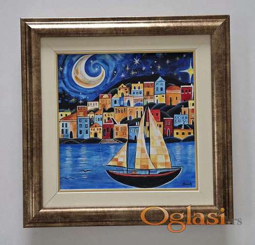 Tekst oglasa: <p>Slika Meseceva straza, tehnika akril na platnu. Prelepo umetnicko delo. Slika je uramljena u jako lep ram, dimenzije slike sa ramom 45 x 45. Privatna kolekcija.</p> |
