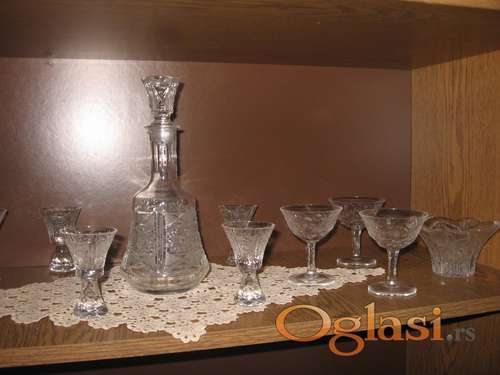 Tekst oglasa: <ul><li>Kristalni set - čaše 6 kom, <br /> čašice 3 kom, (3 na poklon)<br /> dekanter 10x26 cm,<br /> pepeljara<br /> cena 2500 din.</li> </ul> |