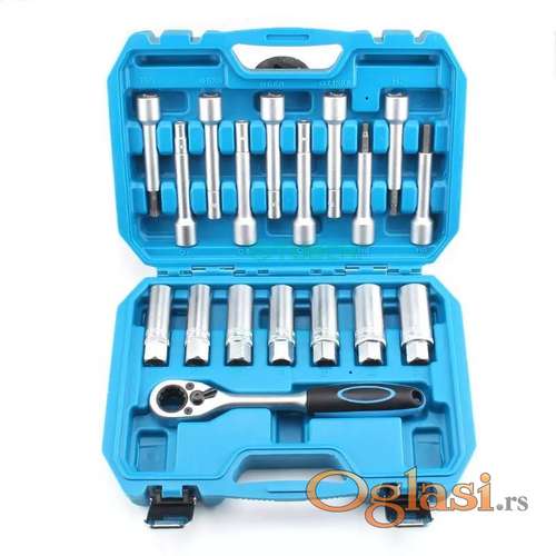 Tekst oglasa: <p>Specijalni alat za automehaničare i autoservise<br /> Komplet sadrži:<br /> -1 x posebna reverzibilna čegrtaljka<br /> -7 x šestougaone utičnice 1/4 prihvat: 16, 17,18,19,21,22,24 mm<br /> -1 kom dodatak T50<br /> -3 kom – nasadni ključ 6-to ugaoni 1/4 prihvat: H6 – H7 – H8 mm<br /> -3 kom – specijalni ulošci sa ključem: 5 x 8 mm – 6 x 8 mm – 7,1 x 9,6 mm<br /> -3 kom. Šestougaoni nasadn na 1/4 prolazni ključevi : 7 – 8 – 9 mm<br /><strong><strong>Mogucnost Licnog Preuzimanja na Novom Beogradu ! !<br /> Slanjem Brzom Postom! </strong></strong></p> |