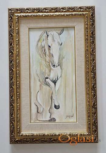 Tekst oglasa: <p>Ulje na platnu Kraljevski konj, prelepo umetnicko delo. Slika je uramljena u jako lep ram, dimenzije slike sa ramom 58 x 38. Privatna kolekcija.</p> |