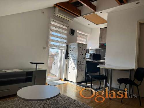 Tekst oglasa: <p>Izdajem skockanu, nameštenu garsonjeru sa galerijom na Vidikovcu, ulica Slavka Rodića 2K, sa prelepim pogledom ka Avali. U blizini je restoran MacDonalds, prodavnica Lidl, prodavnica Maxi, pijaca, osnovna i srednja škola, vrtić, crkva, 7 linija gradskog saobračaja.<br /> Garsonjera je u sklopu kuće od fasadne cigle sa 6 stambenih jedinica, u mirnom kraju sa parking prostorm,.. na drugom spratu, sa kosinom.<br /> Do kuće je dovedena optika, tako da se može uzeti internet ili neki box paket (fix.telefon, IP televizija, Internet preko Telekoma Srbije velike brzine), može i SBB… po želji.<br /> Sa klimom, TA peć, veš mašinom, toplom vodom preko bojlera, terasom.<br /> Cena 399 evra na mesečnom nivou</p> |