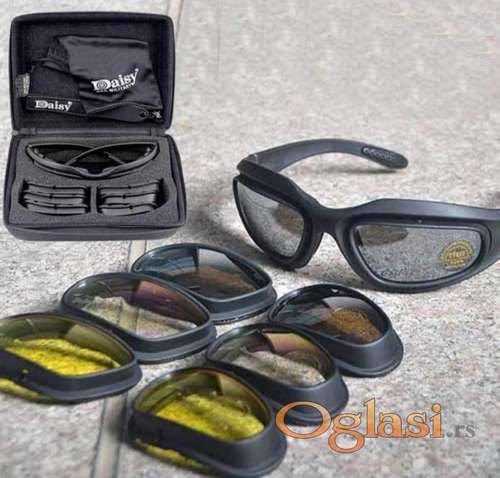 Tekst oglasa: <p>Vojne takticke naocare <strong>DAISY</strong> <strong>MILITARY. Naocare imaju <strong>UV400</strong> zaštitu</strong><br /> Staklo je polikarbonate lens.<br /> Imaju sistem protiv magljenja<br /> Elastican okvir je pogodan za razlicite tipove lica<br /> Stakla se vrlo lako menjaju. <br /> Naočare su pogodne za razne sportove, motociklizam, biciklizam, lov, ribolov, boravak u prirodi, pecanje<br /> 4 para zamenjiva stakla<br /> Na levom staklu je nalepnica sa natpisom Polycarbonate lens<br /><strong>Moguće lično preuzimanje na Novom Beogradu!<br /><strong>Slanjem brzom postom</strong></strong><br /> </p> |