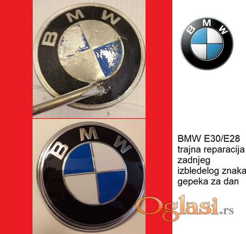 Tekst oglasa: <p><strong>Repariram BMW zadnji znak za E30</strong><strong> ili E28 fab. broj : 51141872969 od vašeg starog sa očuvanim aluminijumskim postoljem.</strong><br /><strong>Ovaj tip znaka je teško pronaći jer je jedinstven samo za ova dva modela -postolja su nekada bila od livenog aluminijuma i obično su i dalje u savršenom stanju, osim znaka koji izbledi.</strong><br /> Reparirani zadnji znak za E30 ili E28 - jednak je po karakteristikama i trajnosti novom jer<br /><strong>za reparaciju koristim novi originalni Demmel aluminijumski metalni reljefni, tvrdo emajlirani, trajni znak. </strong> <br /> Vreme reparacije: 1-2 dana nakon što mi dostavite znak, zavisno od obaveza, oko 24h je potrebno samo da se lepo osuši lepak. Garantujem za trajnost repariranog.<br /><br /><strong>0612309535 NALAZIM SE U BEOGRADU / MAKSIMA GORKOG/ A ZNAK MOŽETE POSLATI I KURIRSKIM SLUŽBAMA PO DOGOVORU.<br /><br /> JOŠ LAKŠA JE REPARACIJA ZA ZADNJI ZNAK X3 E83 - GDE SE NA OŠTEĆEN ZNAK KOJI SE NALAZI NA DOBROM POSTOLJU MOŽE JEDNOSTAVNO, BEZ SKIDANJA SA VOZILA I BEZ SKIDANJA STAROG AMBLEMA SAMO PRILEPITI NOVI LIMENI AMBLEM ODGOVARAJUĆE DIMENZIJE</strong><br /><br /><br /> 51141872969 Trunk lid badge Part 51141872969 was found on the following vehicles:</p> <ul><li>3' E30 (12/1981 — 02/1994)</li> <li>5' E28 (09/1980 — 12/1987)</li> <li>Z3 E36 (04/1996 — 05/2002)</li> </ul><ul><li><strong>IMAM I ORIGINALNE NOVE ZNAKOVE ZA VEĆINU BMW MODELA, ( PLAVO -BELE ) UKLJUČUJUĆI I PREDNJI ZA E30<br /> KINESKE KOPIJE NE DRŽIM</strong></li> </ul> |