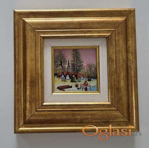 Tekst oglasa: <p>Naiva, ulje na staklu Seoski suton. Minijatura. Prelepo umetnicko delo. Slika je uramljena u jako lep ram, dimenzije slike sa ramom 26 x 26. Privatna kolekcija.</p> |