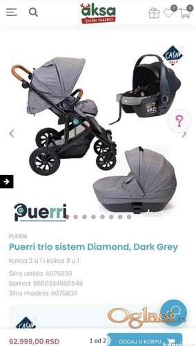Tekst oglasa: <p>Prodajem Puerri Diamond trio sistem – kolica 3u1, u odličnom stanju.</p> <p>✅ Komplet sadrži:</p> <ul><li>kolica (sportsko sedište)</li> <li>nosiljku / auto-sedište</li> <li>korpu za novorođenče</li> </ul><p>Sve je korišćeno za jedno dete, očuvano, bez većih oštećenja</p> <p>📩 Za više informacija ili dodatne slike – slobodno se javite</p> <p>📍 Lično preuzimanje: Ruma</p> <p>📦 Slanje poštom / kurirskom službom moguće</p> |
