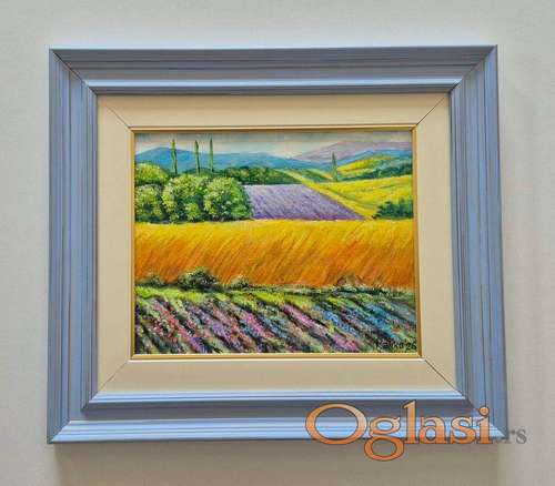 Tekst oglasa: <p>Ulje na platnu Letnji pejzaz, prelepo umetnicko delo. Slika je uramljena u jako lep ram, dimenzije slike sa ramom 45 x 40. Privatna kolekcija.</p> |