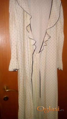Tekst oglasa: <p>Prodajem nekoriscen, elegantan, zenski ogrtac, broj 42 (ramena 42cm, poluobim preko grudi 52cm, dužina 120cm).Sirovinski sastav:70% acetat i 30% poliamid.Boja šampanj sa crnim tufnama.Sapun od prirodnih ulja.Cena za je za oba artikla.Moguće slanje dodatnih slika.</p> |