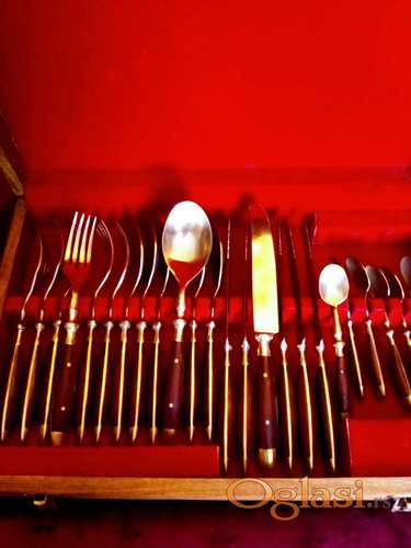 Tekst oglasa: <p>Prodajem escajg od bronze 1.-klasnog kvaliteta, drške su od ružinog drveta, sve u drvenoj kutiji.</p> <p> </p> <p>Kontakt: Natalija</p> |