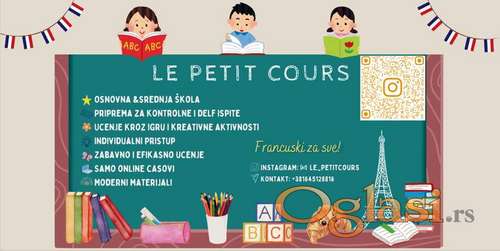 Tekst oglasa: <p>🎯 Privatni časovi francuskog za decu, tinejdžere i odrasle<br /> ✅ Priprema za kontrolne, testove i DELF<br /> ✅ Učenje kroz igru i zabavne aktivnosti<br /> 💻 Online preko Zoom / Google Meet</p> <p>Fleksibilno vreme i individualan pristup</p> <p>📞 Za više informacija i zakazivanje časova:</p> <p>✉️ lepetitcours1@gmail.com ili na broj telefona 0645128816</p> <p> </p> <p> </p> |