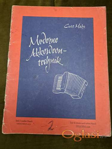 Tekst oglasa: <p>Moderne Akkordeon-technik (B.Schotts Sohne, Mainz) von Curt Mahr. </p> <p>Moderne tehnike za sviranje Harmonike, Kurt Mar. Stanje očuvana. 43 strane. Cena: 800 dinara. Tel.060-58-58-153 </p> |