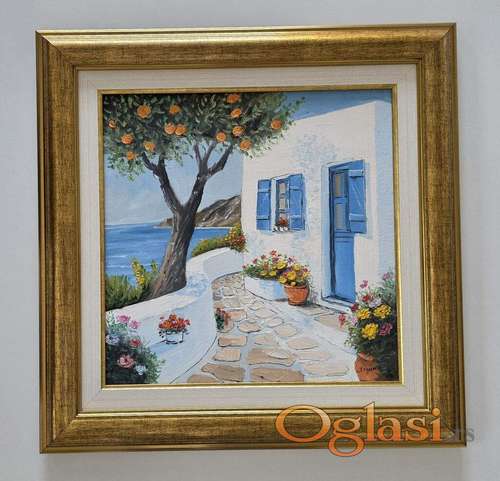 Tekst oglasa: <p>Ulje na platnu Plava vrata, prelepo umetnicko delo. Slika je uramljena u jako lep ram, dimenzije slike sa ramom 59 x 59. Privatna kolekcija.</p> |