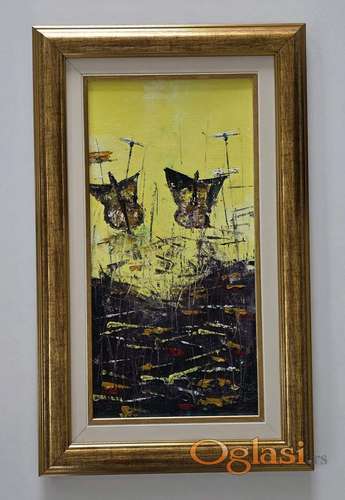 Tekst oglasa: <p>Ulje na platnu Dva leptira, prelepo umetnicko delo. Slika je uramljena u jako lep ram, dimenzije slike sa ramom 52 x 32. Privatna kolekcija.</p> |