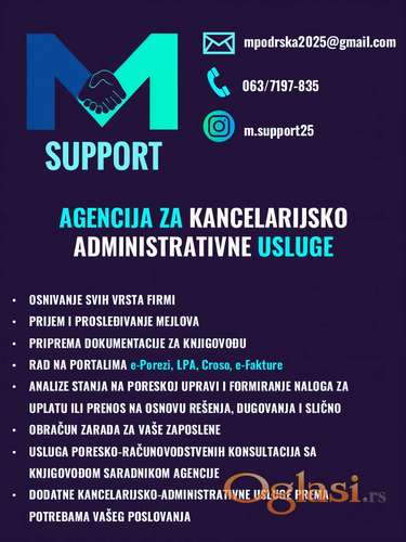 Tekst oglasa: <p>U prilici smo da Vam predstavimo agenciju za kancelarijsko-administrativne poslove kao podršku Vašem poslovanju.</p> <p>Bilo da tek ulazite u poslovni svet ili ste već iskusni na ovom polju, naša agencija je tu da doprinese kvalitetnijem poslovanju i razvijanju Vašeg biznisa.</p> <p>Uz višegodišnje iskustvo u administrativnim poslovima, knjigovodstvu i radu s klijentima iz različitih sfera poslovanja, agencija M support Vam garantuje efikasnost, pouzdanost i fleksibilnost. </p> <p>U prilogu su pojedine administrativne usluge koje nudimo, a otvoreni smo i za prihvatanje svih dodatnih usluga iz ovog domena, u skladu sa Vašim poslovanjem i našim mogućnostima.</p> <p>Na raspolaganju smo za sva dodatna pitanja i nedoumice.</p> <p>M support je Vaša agencija od poverenja.</p> <p>062/1066-246</p> <p>063/7197-835</p> <p> </p> |