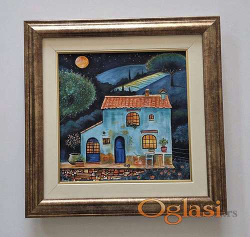 Tekst oglasa: <p>Slika Kuca pod mesecinom, tehnika akril na platnu. Prelepo umetnicko delo. Slika je uramljena u jako lep ram, dimenzije slike sa ramom 45 x 45. Privatna kolekcija.</p> |