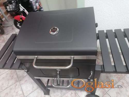 Tekst oglasa: <p><strong>KONTAKT: 065/ 35-89-323</strong></p> <p><strong>MOGUĆOST PLAĆANJA PREKO FIRME</strong></p> <p><strong>RACUN I GARANCIJA</strong></p> <p><strong>NOVO FABRIČKI ZAPAKOVANO</strong></p> <p><strong>----------------------------------------------------------------</strong></p> <p> </p> <p><strong> Karakteristike:</strong></p> <ul><li>Tip: Roštilj</li> <li>Širina površine za pečenje u cm: do 60 cm</li> <li>Dimenzije rešetke: 34,4×24,5 cm (2 komada) od hromiranog čelika debljine 5,5 mm</li> <li>Ukupna veličina u cm: 104,5x 62,5 x98,5 cm</li> <li>Termometar: uključen</li> <li>Boja: crna</li> <li>Materijal kućišta: čelik</li> <li>Pokretljivost: Sa točkićima</li> <li>Radna visina: 81 cm od zemlje</li> <li>Sa rešetkom za zagrevanje</li> <li>Sa bočnom policom</li> <li>Težina pakovanja:23kg</li> </ul> |