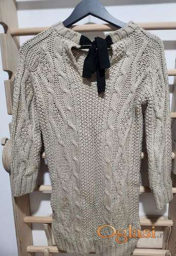 Tekst oglasa: <p>Tunika džemper, od vune i akrila, sa čamac izrezom oko vrata, 3/4 rukavima, i crnim plišanim vezivanjem na vratu, pozadi. M veličina, jednom obučen. Prednji deo je kraći za rub od zadnjeg dela džempera.</p> |