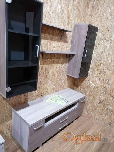 Tekst oglasa: <p><strong>TV SET BARDOLINO</strong> <strong>Dezen : Bardolino</strong> <strong>Komoda 140 x 45 x 56</strong> <strong>Viseći elementi 40 x 30 x 80</strong> <strong>Police na nosačima 80 x 16</strong> <strong>300e</strong></p> |