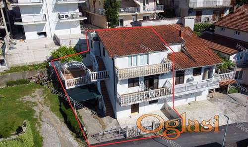 Tekst oglasa: <p>Prodaje se kuća na tri etaže.<br /> - Prizemlje: Jednosoban sta.<br /> - Prvi sprat: Komforan jednosoban stan sa prostranim dnevnim boravkom i izlazom na terasu.<br /> Ispred ulaza se nalazi veliki prostor za uživanje sa odrinom i mjestom za roštilj.<br /> - Potkrovlje: Stan sa dvije spavaće sobe.</p> <p>Ispred kuće je ogradjeno dvorište, garaža i ostava.</p> <p>Objekat je predat na legalizaciju.<br /> Datum izgradnje 1995. godina.</p> <p>Udaljenost od mora je 500 metara.<br /> </p> |