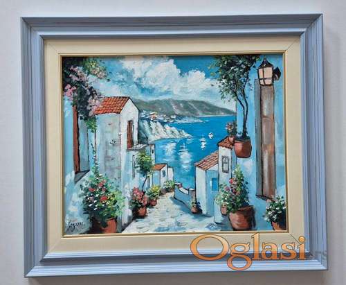 Tekst oglasa: <p>Ulje na lesonitu Plavi mediteran, prelepo umetnicko delo. Slika je uramljena u jako lep ram, dimenzije slike sa ramom 66 x 56. Privatna kolekcija.</p> |