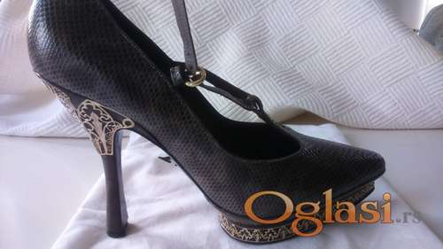 Tekst oglasa: <p>Eksluzivne originalne vintage BALLY salonke od zmijske kože, crno-sive, sa zlatnim aplikacijama na štiklama. Izuzetno elegantne i jedinstvene samo za specijalne prilike. Veličina 39. Nošene jednom, tako da su kao nove. Koštale su 1400 EUR </p> |