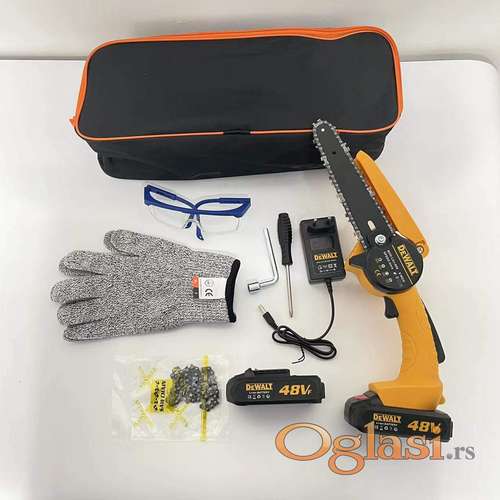 Tekst oglasa: <div> <p>Dewalt Aku testera-Aku ručna testera 48V-Aku lancana testera</p> <p>Testera za secenje drveta obrezivanje i secu vocka, lagana i prenosiva.<br /> lagano telo male velicine moze se drzati jednom rukom</p> <p>Specifikacije<br /> Baterija- Litijumska baterija 48v 6ah<br /> brzina lanca 5m/s</p> <p>Rezni deo oko 17cm</p> <p>Kompret sadrzi<br /> 2 x baterije</p> <p>Rezervni lanac</p> <p>Zastitne rukavice otporne na prosecanje </p> <p>Zastitne naocare<br /> Punjac<br /> Alat za namestanje maca i lanca<br /> Torba za nosenje</p> </div> |