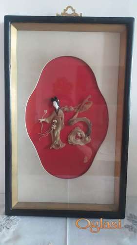 Tekst oglasa: <p>Starinska kineska reljefna 3D umetnička slika.</p> <p>Tehnika: rezbarenje žada i sedefa (mother of pearl art) pričvršćenog za podlogu crvene boje, koja u kineskoj kulturi simbolizuje sreću i blagostanje.</p> <p>Dimenzije 30x48 cm. Iz lične kolekcije, doneto iz Kine 1977 godine. U originalnom ramu, zastakljeno.</p> |