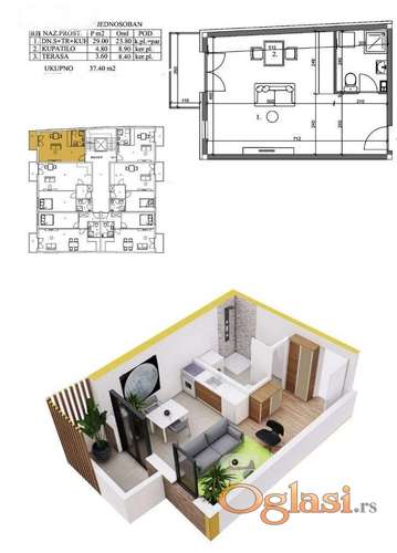 Tekst oglasa: U centru grada na 4-5 min od svih sadržaja koje centar nudi, u ponudi je stan od 37,4 m2 neto. Idealan za rentiranje, pogotovo kao stan na dan. Predviđen završetak gradnje septembar 2027. Mogućnost kupovine garažnog mesta po ceni od 12.000 eura. Na cenu se obračunavaju apsolutna prava 2.5%, nema Pdv-a. Stan nema zasebnu spavaću sobu. Parket I klase, italijanska keramika, grejanje na gas, bešumni lift. Pravna sigurnost zagarantovana. Stan i zgrada predbeleženi u katastru. Dinamika rasta cena u gradu sugeriše brzu realizaciju kupovine, cena se sa završetkom radova menja. Agencijska provizija za kupca 2%. Broj agencije u Registru posrednika 298. Mapa je informativnog karaktera, ne prikazuje tačnu lokaciju nekretnine. |