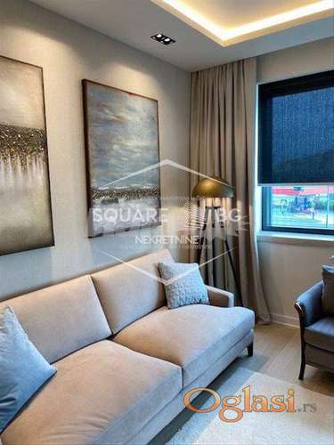 Tekst oglasa: A blok, cetvrta faza nova zgrada, drugi sprat, tri lifta, dvosoban, terasa, veliko kupatilo, dnevna sa trpezarijom, kuhinja Nolte nemačka, spavaća soba, namešten komplet, lux , garaža, obezbedjenje 24 h, može i bez garaže, od 15 aprila. Agencijska provizija 50% |