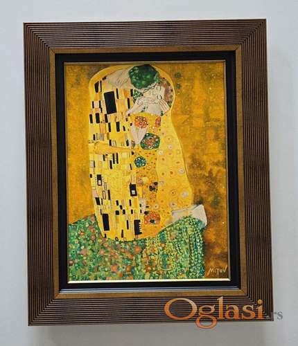 Tekst oglasa: <p>Ulje na platnu Poljubac 3, prelepo umetnicko delo. Slika je uradjena po cuvenoj slici The Kiss, Gustava Klimta. Slika je uramljena u jako lep ram, dimenzije slike sa ramom 54 x 44. Privatna kolekcija.</p> |