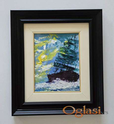 Tekst oglasa: <p>Ulje na platnu Brod ispod nemirnog neba, prelepo umetnicko delo. Slika je uramljena u jako lep ram, dimenzije slike sa ramom 39 x 34. Privatna kolekcija.</p> |