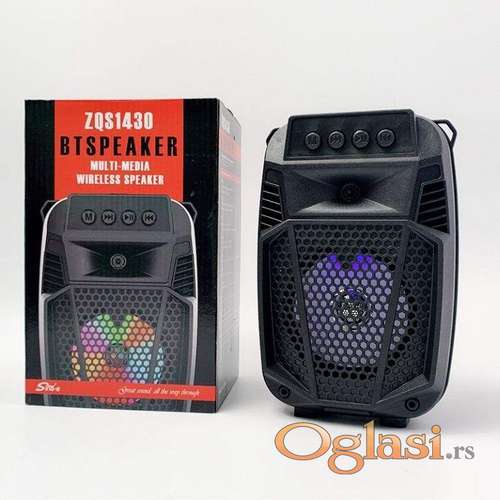 Tekst oglasa: <p>Zvucnik Bluetooth ZQS 1430</p> <p><br /> TEHNIČKE SPECIFIKACIJE</p> <p>MODEL : ZQS-1430</p> <p>– Bluetooth bežična veza</p> <p>– FM radio: 87 Mhz – 108 Mhz</p> <p>– Izlazna snaga: 8W</p> <p>– Frekvencijski odziv 45Hz-18KHz 50dB</p> <p>– Dugme ON/OFF</p> <p>– Led zvučnik RGB boja</p> <p>– Kontrola jačine zvuka</p> <p>– Ulaz za mikrofon 6,5 mm</p> <p>– Ugrađena baterija 3.7v 1200 mAh</p> <p>– DC: 5V microUSB</p> <p>– MP3 reprodukcija sa USB kartice</p> <p>- Punjiva baterija</p> <p>– Dimenzije (D*Š*V): 220/150/110 mm</p> <p><br /> </p> <p>---------------------------------Ukoliko zelite da porucite-------------------<br /> Posaljite poruku preko SMS PORUKE, VIBER<br /> 1 Ime i prezime<br /> 2 Ulica i broj<br /> 3 Mesto i postanski broj<br /> 4 Broj telefona za kontakt</p> |